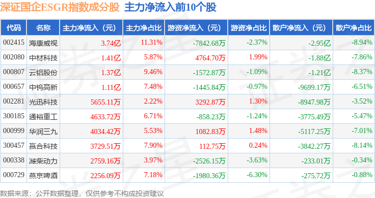 资金流向方面,深证国企ESGR(470055)指数成份股当日主力资金净流出合计3.4亿元,游资资金净流入合计2.14亿元,散户资金净流入合计1.26亿元。成份股资金流向详情见下表: