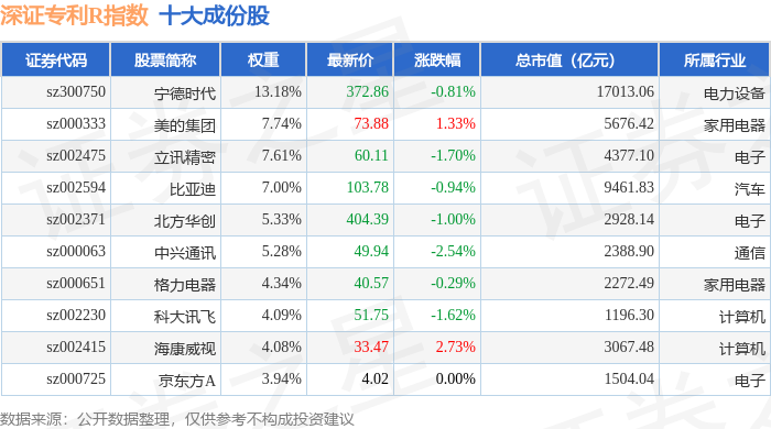 深证专利R(470067)指数十大成份股详情如下: