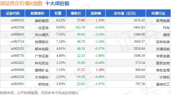 深证民企价值R(470072)指数十大成份股详情如下: