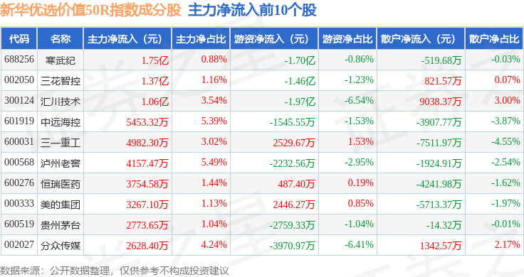资金流向方面,新华优选价值50R(489004)指数成份股当日主力资金净流出合计74.28亿元,游资资金净流入合计33.27亿元,散户资金净流入合计41.02亿元。成份股资金流向详情见下表: