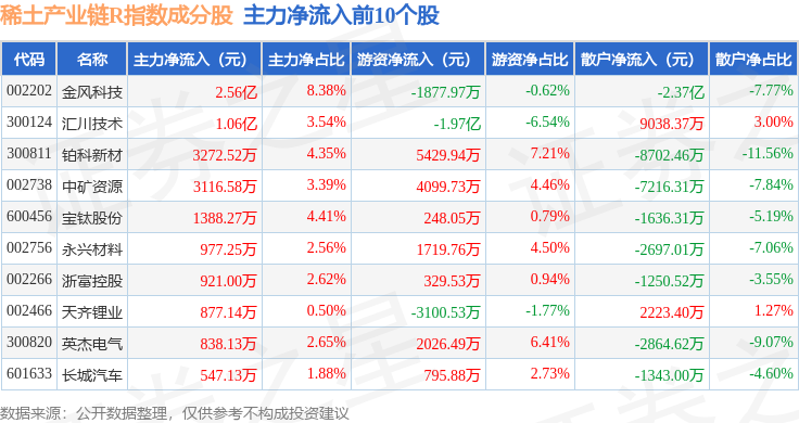 资金流向方面,稀土产业链R(489013)指数成份股当日主力资金净流出合计49.84亿元,游资资金净流入合计11.64亿元,散户资金净流入合计38.2亿元。成份股资金流向详情见下表:
