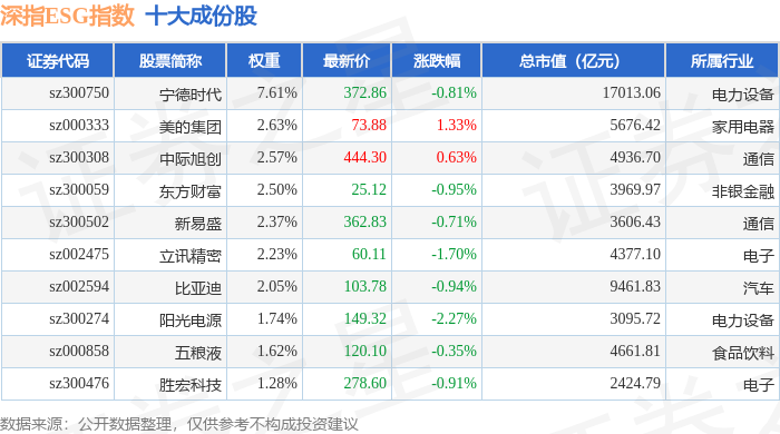 证券之星消息,10月22日,深指ESG(970026)指数报收于13851.8点,跌0.59%,成交3599.8亿元,换手率1.3%。当日该指数成份股中,上涨的有118家,天孚通信以7.08%的涨幅领涨,下跌的有265家,锐捷网络以9.67%的跌幅领跌。