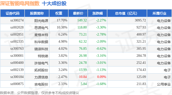 证券之星消息,10月22日,深证智能电网(970054)指数报收于3654.78点,跌1.97%,成交240.35亿元,换手率2.79%。当日该指数成份股中,上涨的有11家,昇辉科技以6.35%的涨幅领涨,下跌的有38家,华明装备以4.59%的跌幅领跌。