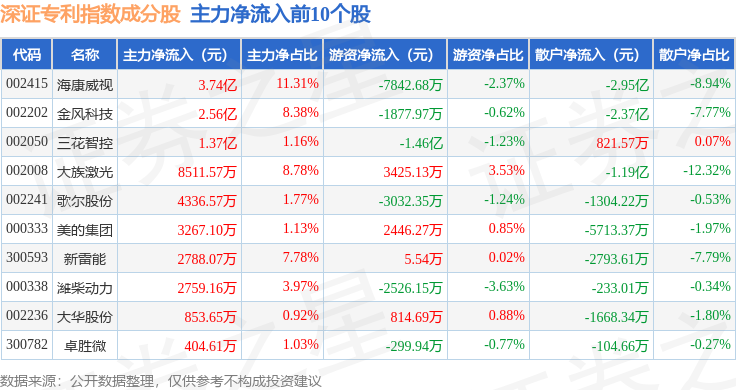 资金流向方面,深证专利(970067)指数成份股当日主力资金净流出合计30.7亿元,游资资金净流入合计11.44亿元,散户资金净流入合计19.25亿元。成份股资金流向详情见下表: