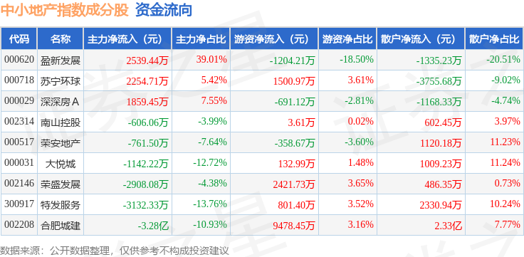 资金流向方面,中小地产(971002)指数成份股当日主力资金净流出合计3.47亿元,游资资金净流入合计1.21亿元,散户资金净流入合计2.26亿元。成份股资金流向详情见下表: