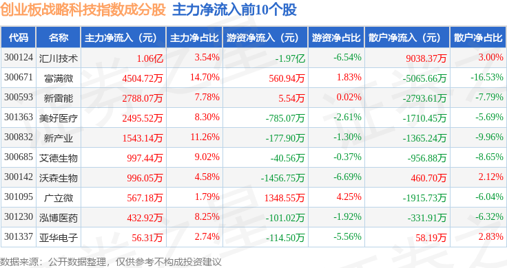 资金流向方面,创业板战略科技(971004)指数成份股当日主力资金净流出合计15.93亿元,游资资金净流入合计3.06亿元,散户资金净流入合计12.87亿元。成份股资金流向详情见下表: