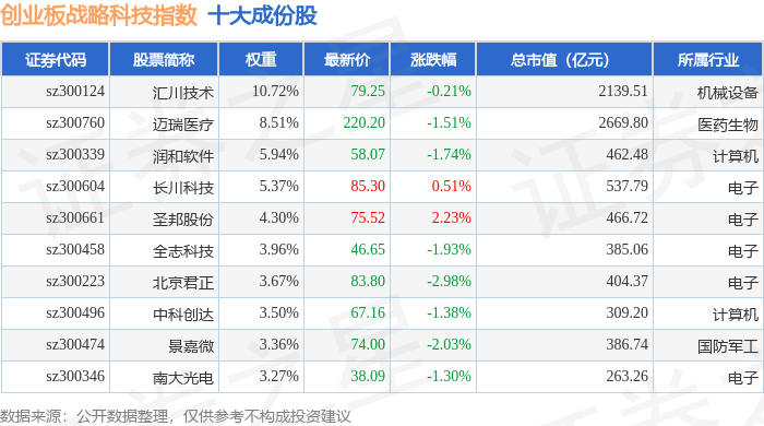 创业板战略科技(971004)指数十大成份股详情如下: