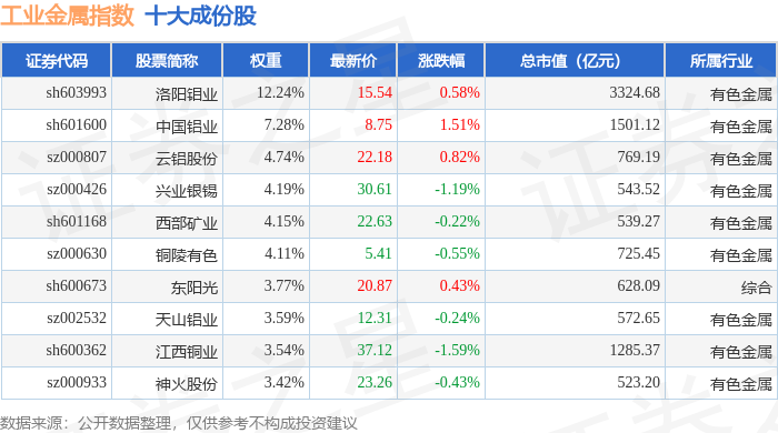 工业金属(980043)指数十大成份股详情如下:
