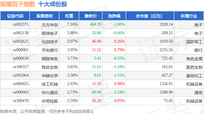 证券之星消息,10月22日,规模因子(980055)指数报收于1942.14点,跌0.62%,成交401.61亿元,换手率1.17%。当日该指数成份股中,上涨的有16家,海康威视以2.73%的涨幅领涨,下跌的有33家,龙佰集团以3.33%的跌幅领跌。