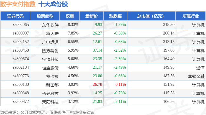 数字支付(980113)指数十大成份股详情如下: