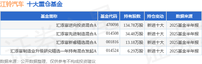 持有江铃汽车最多的基金为汇添富逆向投资混合A,目前规模为6.21亿元,最新净值3.987(10月22日),较上一交易日下跌0.72%,近一年上涨26.01%。该基金现任基金经理为董超。