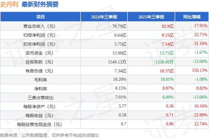 据证券之星公开数据整理,近期史丹利(002588)发布2025年三季报。根据财报显示,史丹利营收净利润同比双双增长。截至本报告期末,公司营业总收入92.9亿元,同比上升17.91%,归母净利润8.15亿元,同比上升22.71%。按单季度数据看,第三季度营业总收入28.99亿元,同比上升31.41%,第三季度归母净利润2.08亿元,同比上升35.36%。