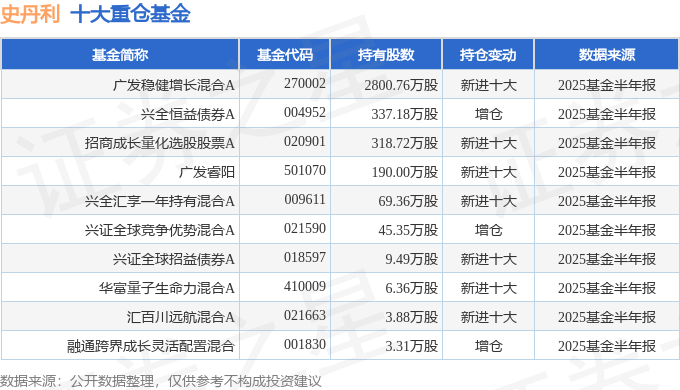 持有史丹利最多的基金为广发稳健增长混合A,目前规模为108.93亿元,最新净值1.6272(10月22日),较上一交易日下跌0.42%,近一年上涨8.97%。该基金现任基金经理为傅友兴 周智硕。