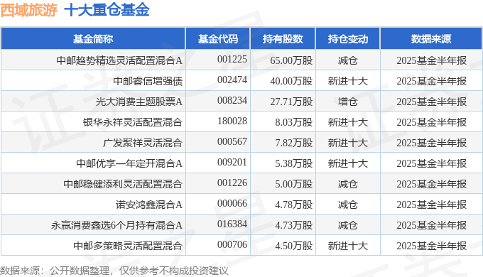 持有西域旅游最多的基金为中邮趋势精选灵活配置混合A,目前规模为7.5亿元,最新净值0.557(10月21日),较上一交易日上涨1.27%,近一年上涨15.8%。该基金现任基金经理为梁雪丹。