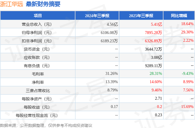 据证券之星公开数据整理,近期浙江华远(301535)发布2025年三季报。截至本报告期末,公司营业总收入5.41亿元,同比上升18.64%,归母净利润7895.28万元,同比上升29.3%。按单季度数据看,第三季度营业总收入1.97亿元,同比上升16.72%,第三季度归母净利润2059.73万元,同比上升6.05%。本报告期浙江华远公司应收账款体量较大,当期应收账款占最新年报归母净利润比达287.13%。