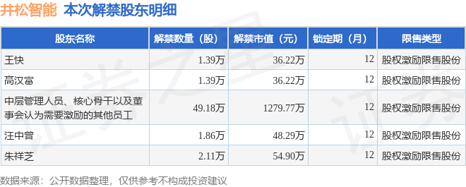 证券之星消息,根据市场公开信息整理,井松智能(688251)于10月23日将有55.93万股限售股份解禁,为公司股权激励限售股份,占公司总股本0.56%。(本次数据根据历史公告整理得出,实际情况以上市公司最新公告为准)本次解禁后,公司还有4021.9万股限售股份,占总股本39.92%。具体如下图所示:
