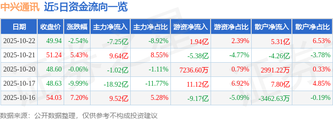 证券之星消息,截至2025年10月22日收盘,中兴通讯(000063)报收于49.94元,下跌2.54%,换手率4.07%,成交量163.86万手,成交额81.3亿元。