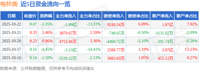 证券之星消息,截至2025年10月22日收盘,格林美(002340)报收于8.07元,下跌3.35%,换手率3.69%,成交量187.57万手,成交额15.19亿元。