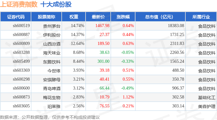 上证消费(000036)指数十大成份股详情如下: