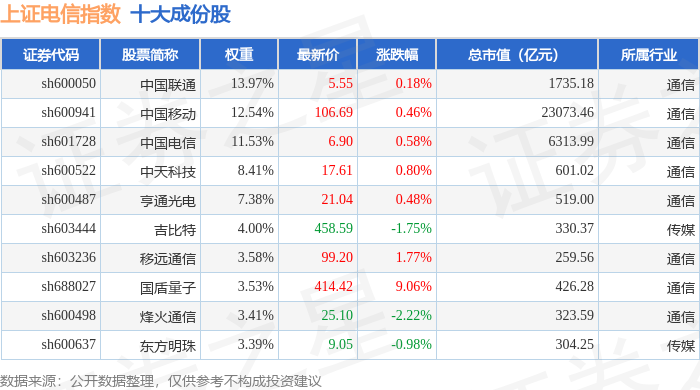 证券之星消息,10月23日,上证电信(000040)指数报收于3899.09点,涨0.57%,成交151.49亿元,换手率0.61%。当日该指数成份股中,上涨的有23家,国盾量子以9.06%的涨幅领涨,下跌的有7家,烽火通信以2.22%的跌幅领跌。