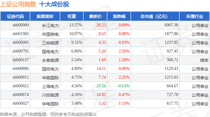 上证公用(000041)指数十大成份股详情如下: