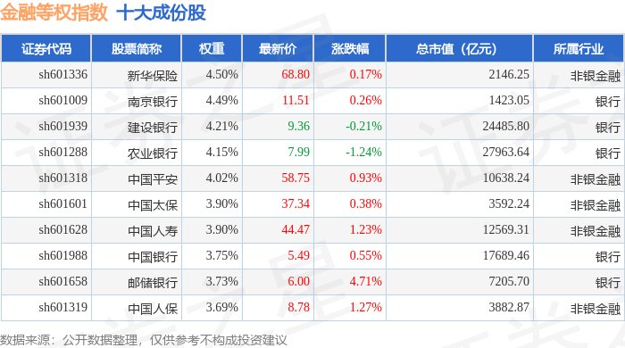 证券之星消息,10月23日,金融等权(000076)指数报收于5738.15点,涨0.73%,成交496.53亿元,换手率0.39%。当日该指数成份股中,上涨的有26家,邮储银行以4.71%的涨幅领涨,下跌的有4家,农业银行以1.24%的跌幅领跌。