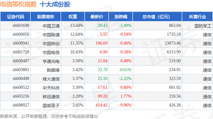证券之星消息,10月23日,电信等权(000078)指数报收于3228.5点,涨0.29%,成交151.49亿元,换手率0.61%。当日该指数成份股中,上涨的有23家,国盾量子以9.06%的涨幅领涨,下跌的有7家,烽火通信以2.22%的跌幅领跌。