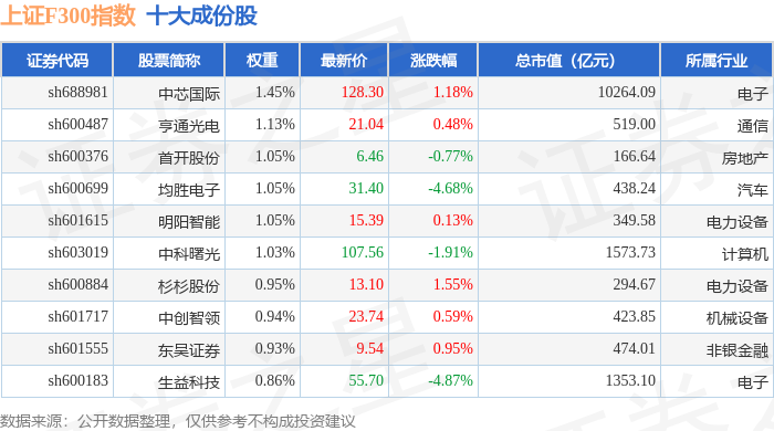 证券之星消息,10月23日,上证F300(000099)指数报收于9034.12点,涨0.33%,成交1322.11亿元,换手率1.34%。当日该指数成份股中,上涨的有204家,秦港股份以10.14%的涨幅领涨,下跌的有91家,生益科技以4.87%的跌幅领跌。