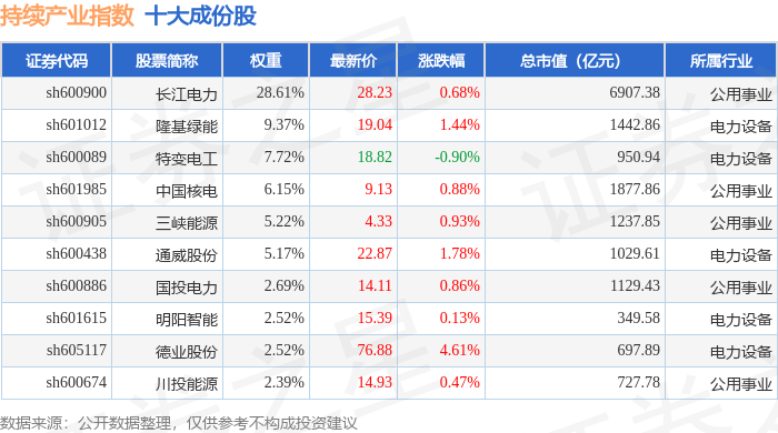 证券之星消息,10月23日,持续产业(000114)指数报收于1246.74点,涨0.71%,成交224.56亿元,换手率0.87%。当日该指数成份股中,上涨的有33家,德业股份以4.61%的涨幅领涨,下跌的有5家,爱旭股份以1.93%的跌幅领跌。
