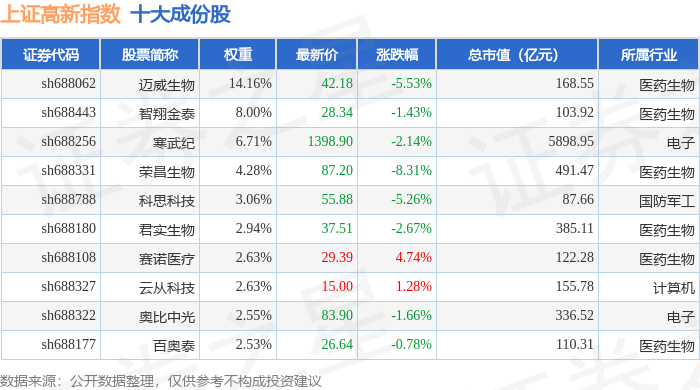 证券之星消息,10月23日,上证高新(000131)指数报收于3633.86点,跌1.69%,成交364.12亿元,换手率1.48%。当日该指数成份股中,上涨的有18家,国盾量子以9.06%的涨幅领涨,下跌的有32家,荣昌生物以8.31%的跌幅领跌。