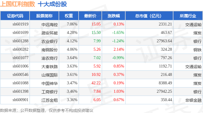 证券之星消息,10月23日,上国红利(000151)指数报收于1607.9点,涨0.78%,成交288.57亿元,换手率0.31%。当日该指数成份股中,上涨的有24家,恒源煤电以4.78%的涨幅领涨,下跌的有6家,潞安环能以1.65%的跌幅领跌。
