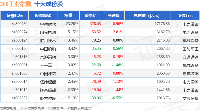 300工业(000910)指数十大成份股详情如下: