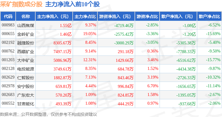 资金流向方面,采矿指数(399232)成份股当日主力资金净流出合计3.4亿元,游资资金净流入合计1.72亿元,散户资金净流入合计1.68亿元。成份股资金流向详情见下表: