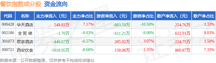 资金流向方面,餐饮指数(399238)成份股当日主力资金净流出合计912.49万元,游资资金净流出合计1050.79万元,散户资金净流入合计1963.28万元。成份股资金流向详情见下表: