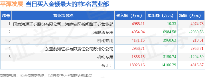 证券之星消息,沪深交易所2025年10月23日公布的交易公开信息显示,平潭发展(000592)因日涨幅偏离值达到7%的前5只证券登上龙虎榜。此次是近5个交易日内第3次上榜。