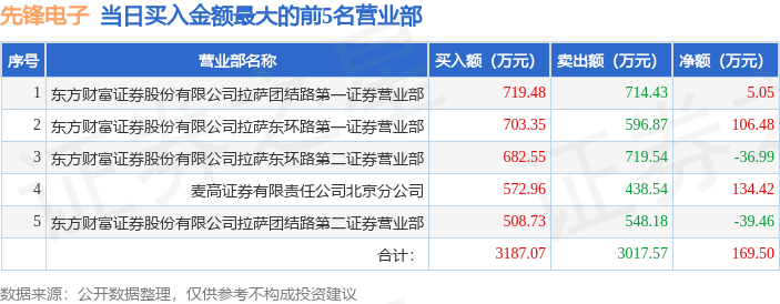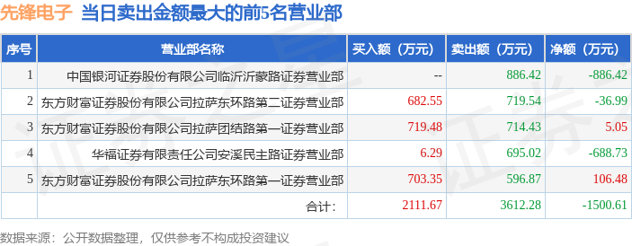 证券之星消息,沪深交易所2025年10月23日公布的交易公开信息显示,先锋电子(002767)因日跌幅偏离值达到7%的前5只证券登上龙虎榜。此次是近5个交易日内第3次上榜。