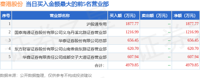 证券之星消息,沪深交易所2025年10月23日公布的交易公开信息显示,秦港股份(601326)因有价格涨跌幅限制的日收盘价格涨幅偏离值达到7%的前五只证券登上龙虎榜。此次是近5个交易日内第1次上榜。