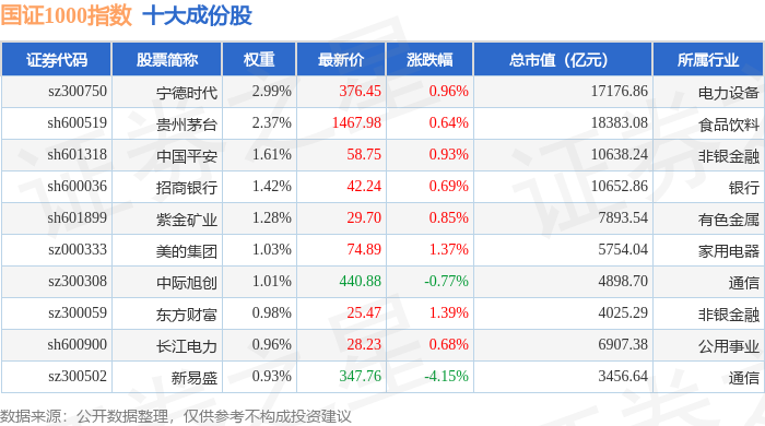 证券之星消息,10月23日,国证1000(399311)指数报收于4871.07点,涨0.26%,成交8057.9亿元,换手率0.96%。当日该指数成份股中,上涨的有611家,盛新锂能以10.03%的涨幅领涨,下跌的有363家,乖宝宠物以14.42%的跌幅领跌。