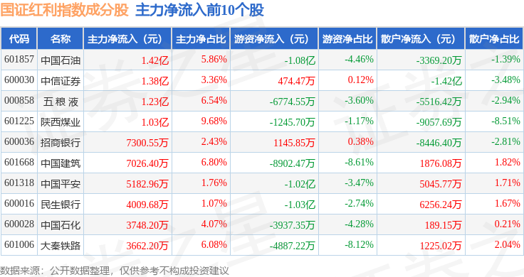 资金流向方面,国证红利(399321)指数成份股当日主力资金净流出合计11.11亿元,游资资金净流入合计2.97亿元,散户资金净流入合计8.13亿元。成份股资金流向详情见下表: