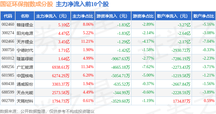 资金流向方面,国证环保(399358)指数成份股当日主力资金净流入合计1.17亿元,游资资金净流出合计6.73亿元,散户资金净流入合计5.57亿元。成份股资金流向详情见下表: