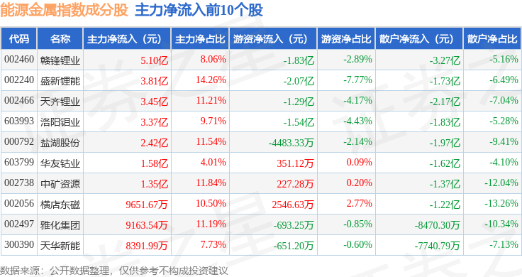 资金流向方面,能源金属(399366)指数成份股当日主力资金净流入合计4.86亿元,游资资金净流出合计6.32亿元,散户资金净流入合计1.46亿元。成份股资金流向详情见下表: