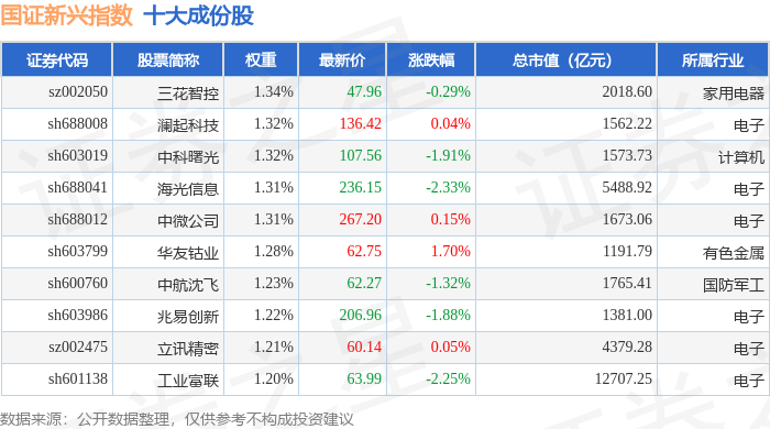 证券之星消息,10月23日,国证新兴(399392)指数报收于2997.71点,涨0.1%,成交2311.95亿元,换手率0.87%。当日该指数成份股中,上涨的有54家,赣锋锂业以5.56%的涨幅领涨,下跌的有41家,新易盛以4.15%的跌幅领跌。