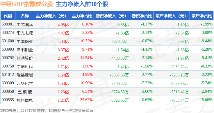 资金流向方面,中经GDP(399399)指数成份股当日主力资金净流出合计35.7亿元,游资资金净流出合计8.02亿元,散户资金净流入合计43.72亿元。成份股资金流向详情见下表: