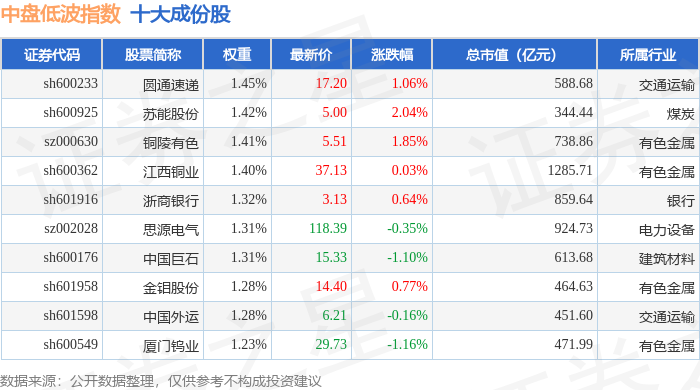 证券之星消息,10月23日,中盘低波(399406)指数报收于13428.53点,涨0.7%,成交349.75亿元,换手率0.96%。当日该指数成份股中,上涨的有68家,深圳能源以9.96%的涨幅领涨,下跌的有26家,养元饮品以5.62%的跌幅领跌。