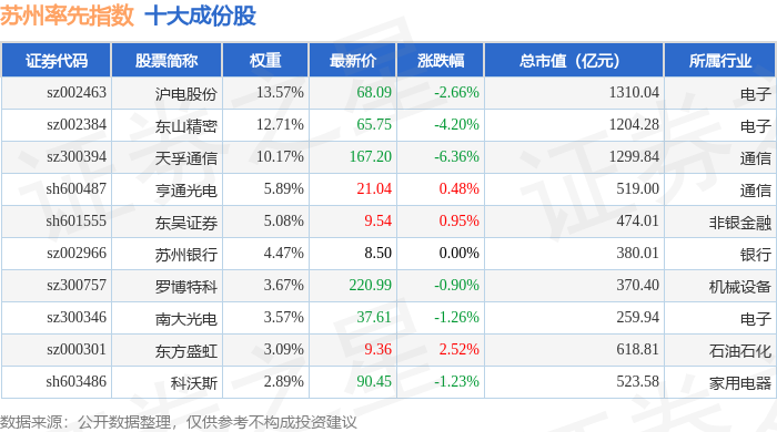 证券之星消息,10月23日,苏州率先(399410)指数报收于2561.57点,跌1.65%,成交229.52亿元,换手率1.47%。当日该指数成份股中,上涨的有10家,天华新能以8.36%的涨幅领涨,下跌的有18家,天孚通信以6.36%的跌幅领跌。