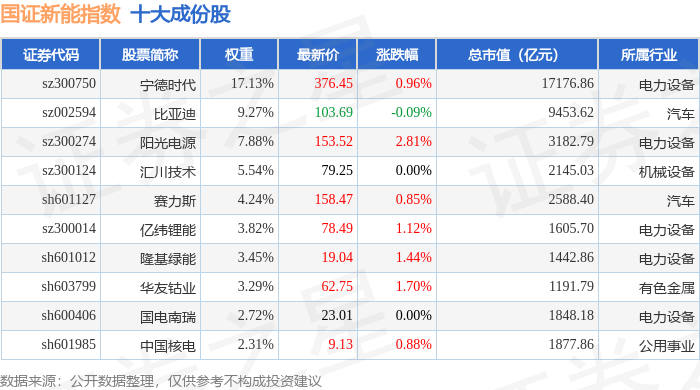 国证新能(399412)指数十大成份股详情如下: