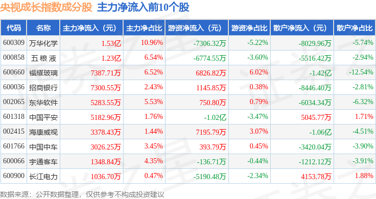 资金流向方面,央视成长(399552)指数成份股当日主力资金净流出合计4.83亿元,游资资金净流入合计1.39亿元,散户资金净流入合计3.44亿元。成份股资金流向详情见下表:
