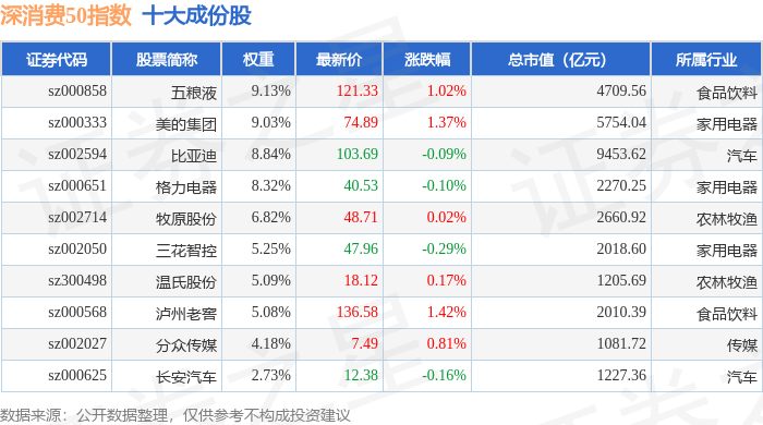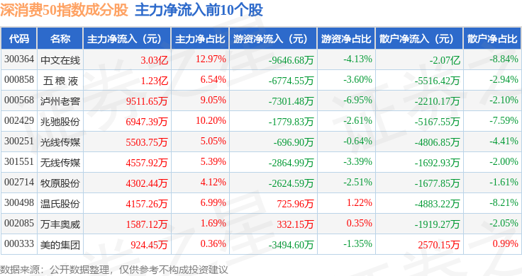 资金流向方面,深消费50(399646)指数成份股当日主力资金净流出合计9.63亿元,游资资金净流出合计2.61亿元,散户资金净流入合计12.24亿元。成份股资金流向详情见下表: