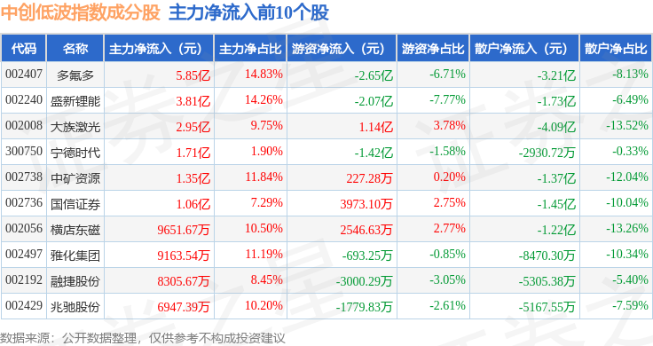 资金流向方面,中创低波(399665)指数成份股当日主力资金净流出合计11.51亿元,游资资金净流出合计5.56亿元,散户资金净流入合计17.07亿元。成份股资金流向详情见下表: