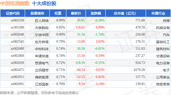 证券之星消息,10月23日,中创低波(399665)指数报收于2293.39点,涨0.58%,成交1121.99亿元,换手率1.46%。当日该指数成份股中,上涨的有126家,盛新锂能以10.03%的涨幅领涨,下跌的有66家,楚江新材以6.23%的跌幅领跌。